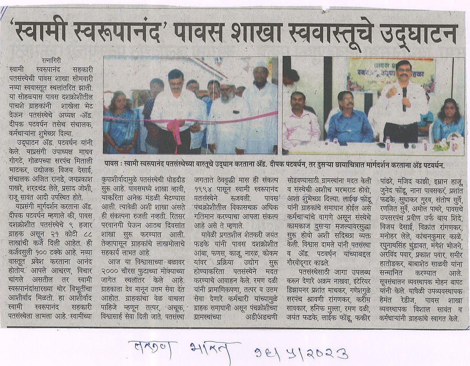सोडवण्यासाठी ग्रामस्थांना मदत केली व संस्थेची अशीच भरभराट होवो, अशा शुभेच्छा दिल्या. लाईक फोंडू यांनी ग्राहकांचे समाधान होईल असे कर्मचाऱ्यांचे वागणे असून संस्थेचे कामकाज दुसऱ्या मजल्यावरसुद्धा सुरू होवो अशी सदिच्छा व्यक्त केली. विश्वास दामले यांनी पतसंस्था व अॅड. पटवर्धन यांच्याबद्दल गौरवोद्गार काढले.
