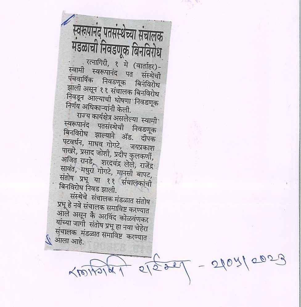 राज्य कार्यक्षेत्र असलेल्या स्वामी स्वरूपानंद पतसंस्थेची निवडणूक बिनविरोध झाल्याने अॅड. दीपक पटवर्धन, माधव गोगटे, जयप्रकाश पाखरे, प्रसाद जोशी, प्रदीप कुलकर्णी, अजित रानडे, शरदचंद्र लेले, राजेंद्र सावंत, मधुरा गोगटे, मानसी बापट, संतोष प्रभू या ११ संचालकांची बिनविरोध निवड झाली.