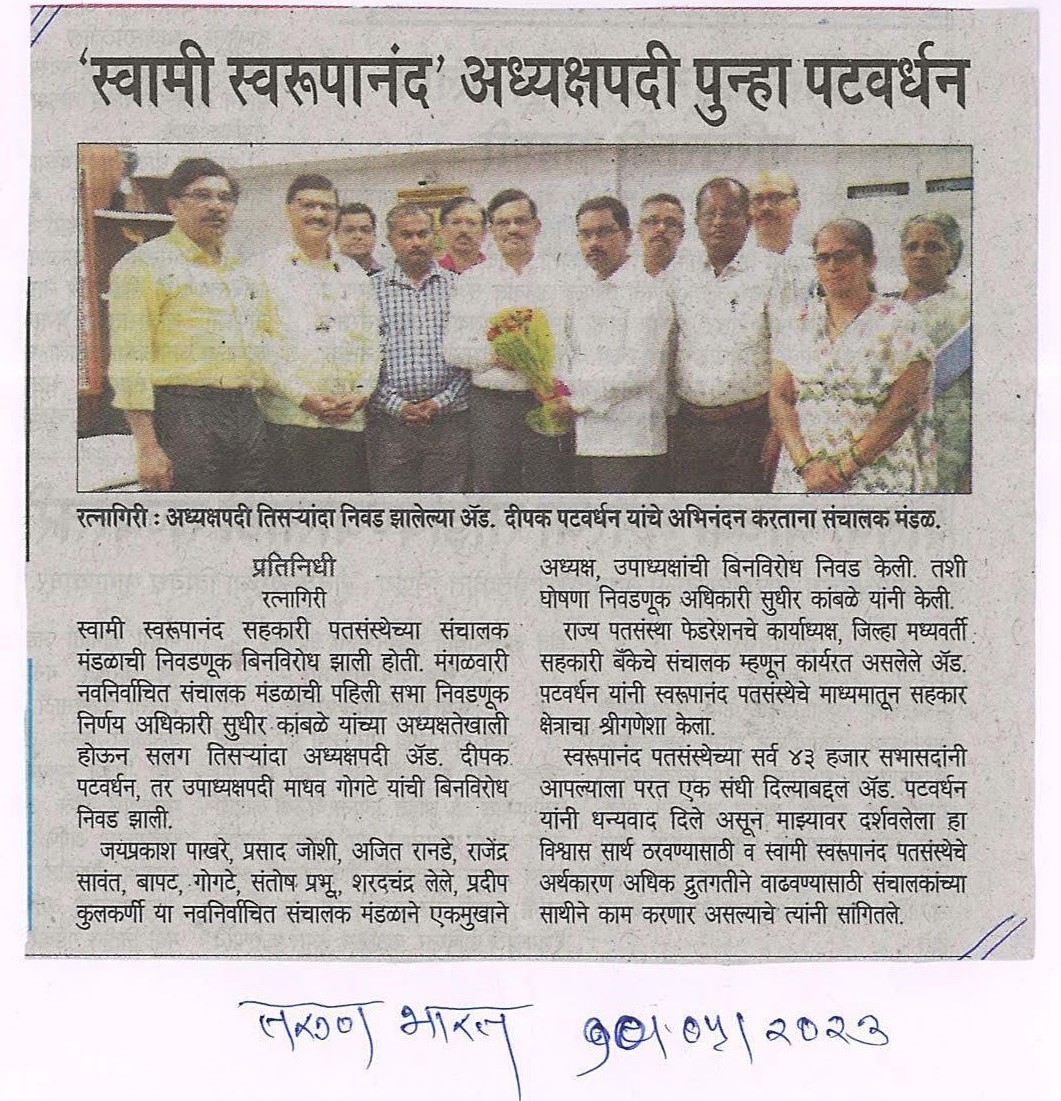 स्वामी स्वरूपानंद सहकारी पतसंस्थेच्या संचालक मंडळाची निवडणूक बिनविरोध झाली होती. मंगळवारी नवनिर्वाचित संचालक मंडळाची पहिली सभा निवडणूक निर्णय अधिकारी सुधीर कांबळे यांच्या अध्यक्षतेखाली होऊन सलग तिसऱ्यांदा अध्यक्षपदी अॅड. दीपक पटवर्धन, तर उपाध्यक्षपदी माधव गोगटे यांची बिनविरोध निवड झाली.