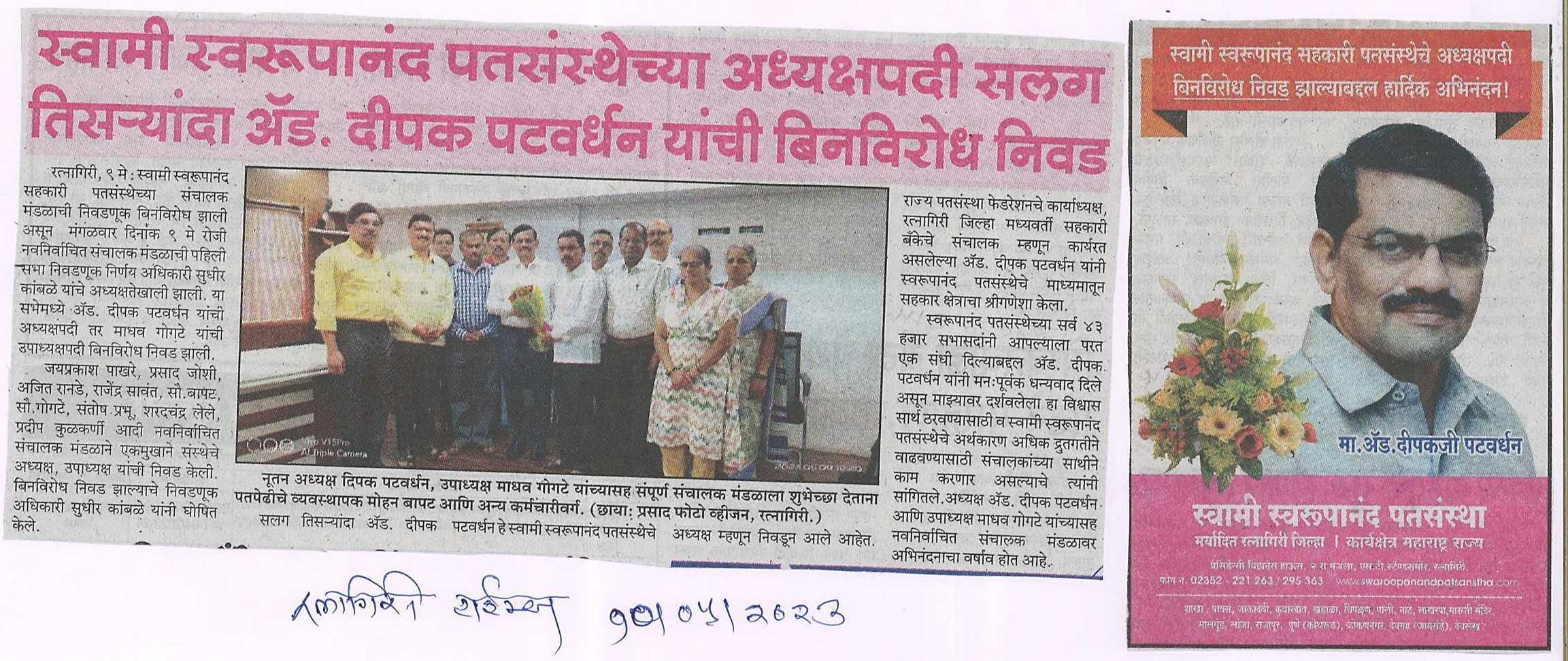 स्वामी स्वरूपानंद सहकारी पतसंस्थेच्या संचालक मंडळाची निवडणूक बिनविरोध झाली असून मंगळवार दिनांक ९ मे रोजी नवनिर्वाचित संचालक मंडळाची पहिली सभा निवडणूक निर्णय अधिकारी सुधीर कांबळे यांचे अध्यक्षतेखाली झाली. या सभेमध्ये अॅड. दीपक पटवर्धन यांची अध्यक्षपदी तर माधव गोगटे यांची उपाध्यक्षपदी बिनविरोध निवड झाली.